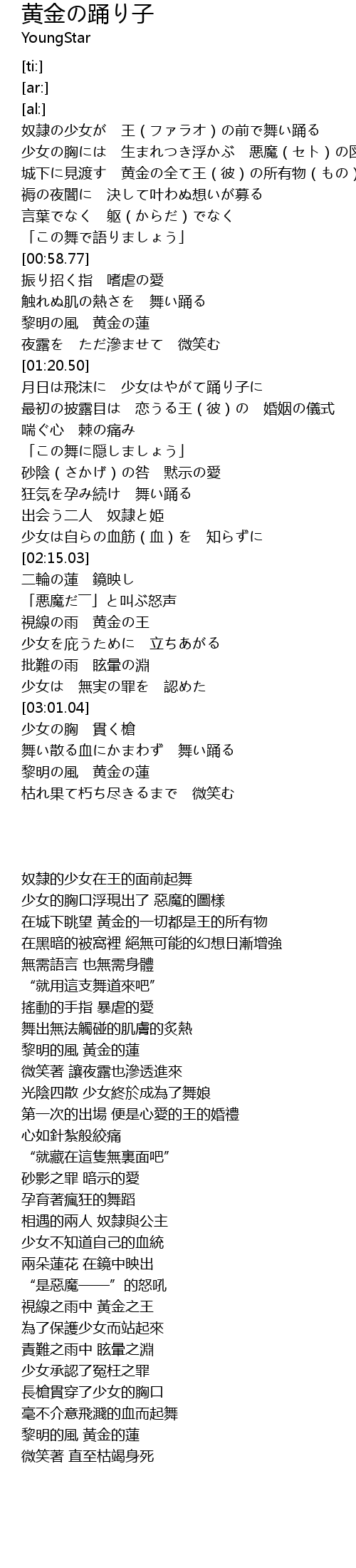 | [00:18.31] | 奴隷の少女が 王(ファラオ)の前で舞い踊る |