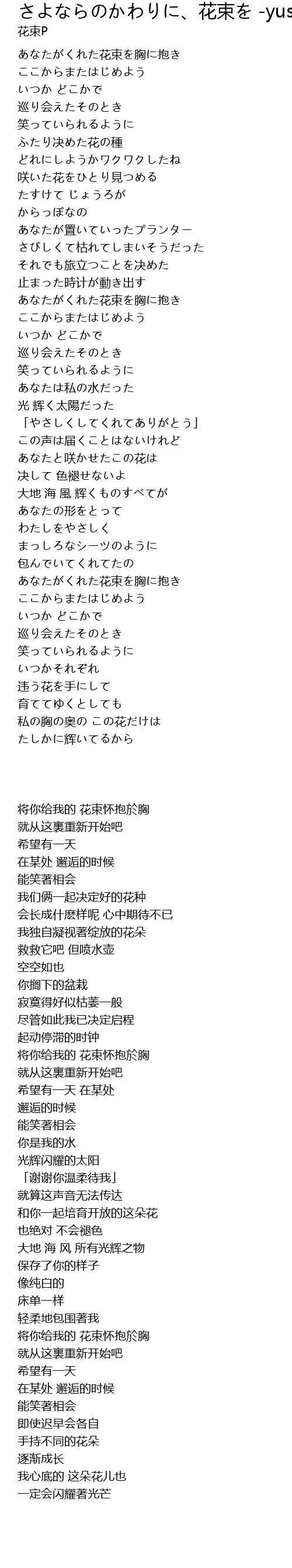 | [00:00.59] | あなたがくれた花束を胸に抱き |