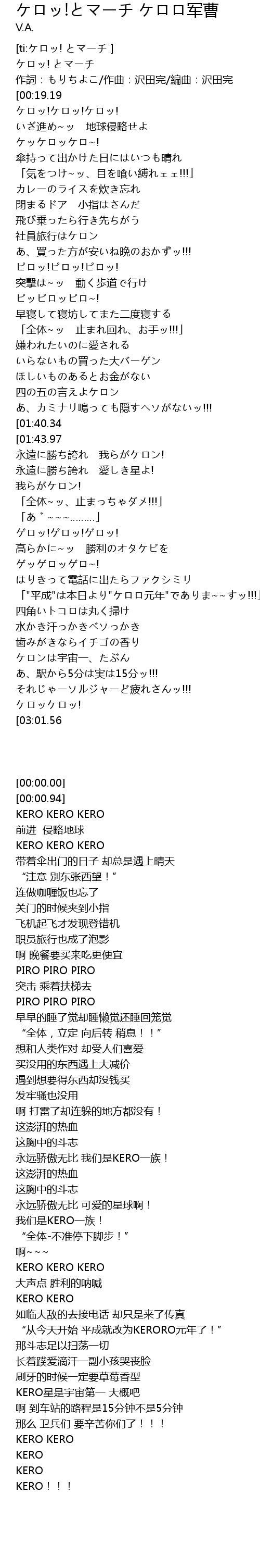 | [03:00.80][03:01.56][03:03.68] | ケロッ!!! |