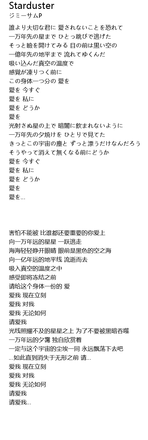 | [03:30.690] | きっとこの宇宙の塵と ずっと漂うだけなんだろう |