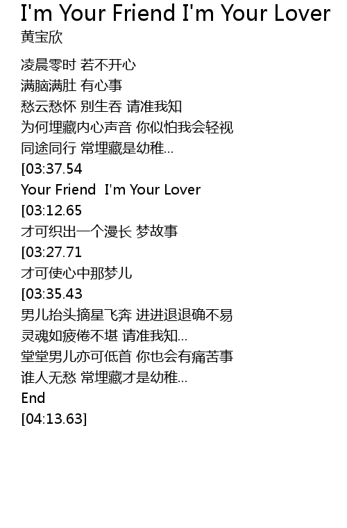 | [03:51.23][03:37.54][03:23.90][03:09.00][02:10.57][01:55.81][01:01.34][00:46.32] | I' m Your Friend I' m Your Lover |