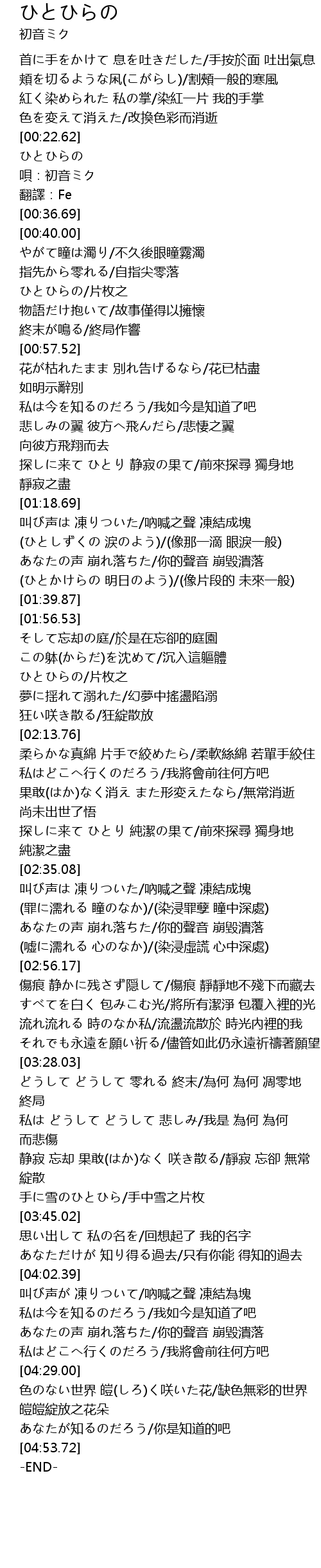| [04:38.83] | 色のない世界 皚(しろ)く咲いた花/缺色無彩的世界 皚皚綻放之花朵 |