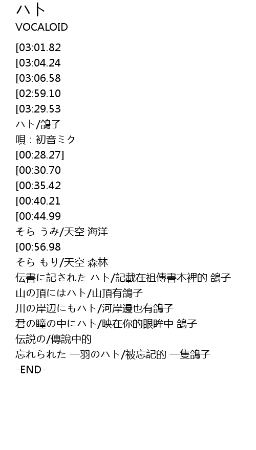 | [02:18.65][00:30.70] | ハトがくる ハトがくる/鴿子來囉 鴿子來囉 |