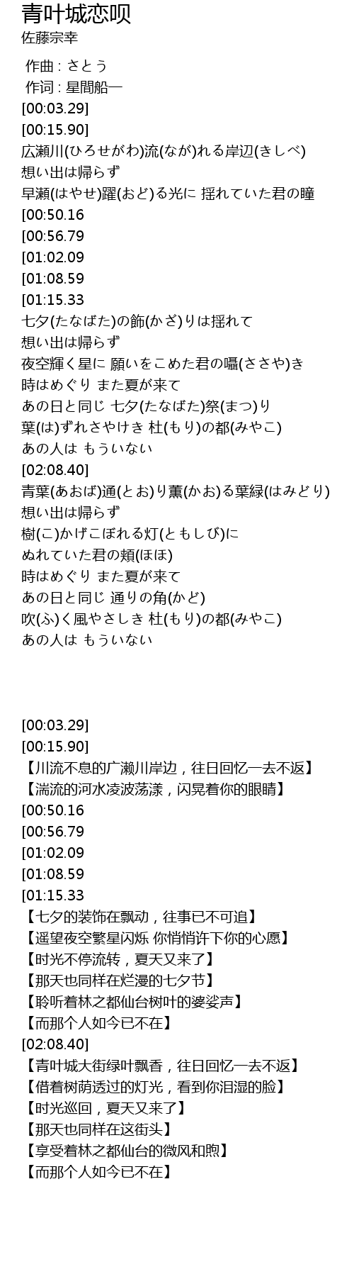 | [03:30.93][01:02.09] | 瀬音(せおと)ゆかしき 杜(もり)の都(みやこ) |