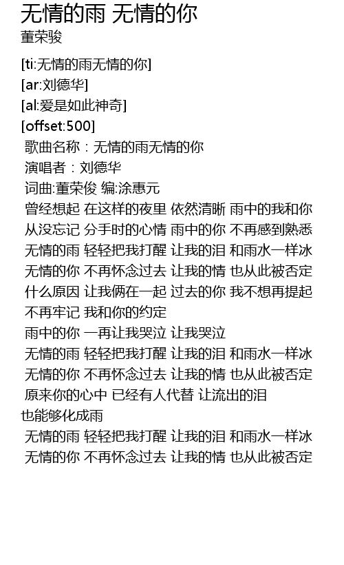 | [00:10.767] | 歌曲名称:无情的雨无情的你 |