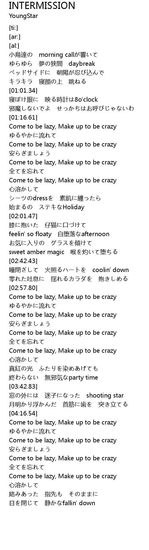 | [04:39.79] | Come to be lazy, Make up to be crazy |
