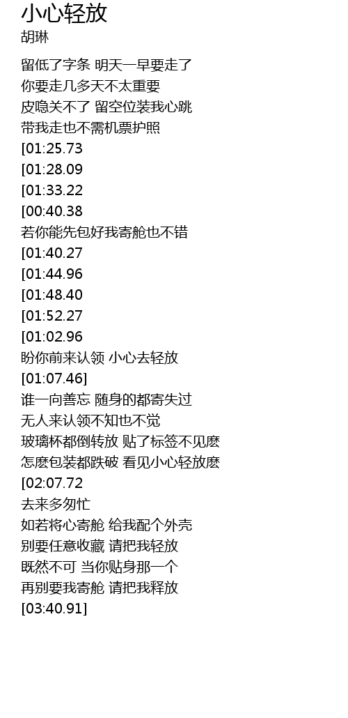 | [03:05.18][01:48.40][00:53.24] | 易碎的都包妥 请把我轻放 |