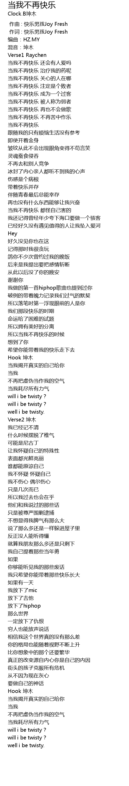 | [00:25.467] | dāng wǒ bù zài kuài lè zài yě bú huì zuò gē |