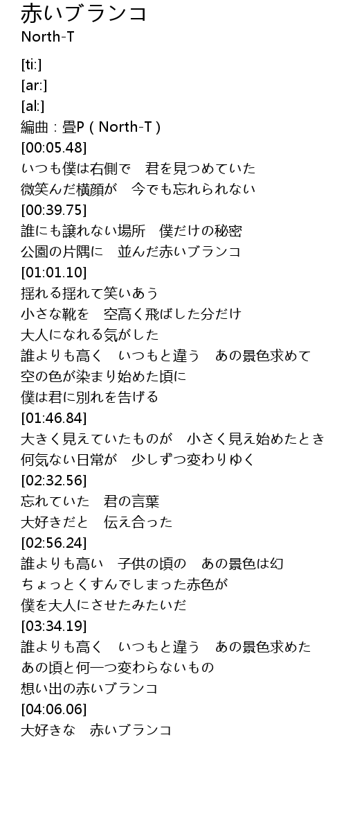 | [00:50.81] | 公園の片隅に 並んだ赤いブランコ |
