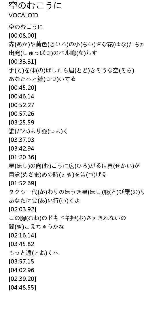 | [00:35.19] | 手(て)を伸(の)ばしたら届(とど)きそうな空(そら) |