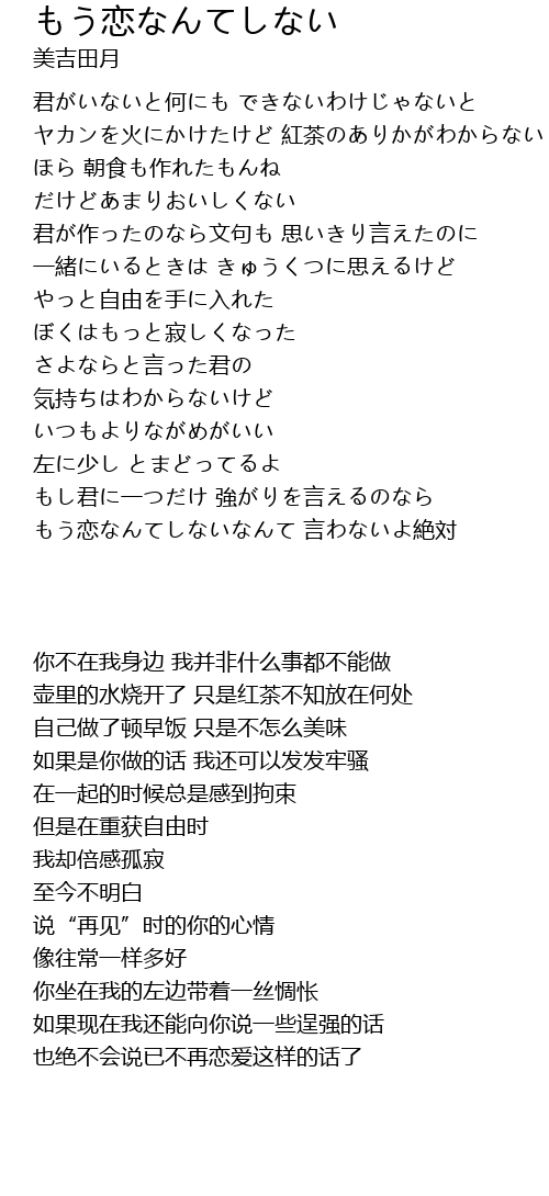| [01:47.27] | もう恋なんてしないなんて 言わないよ絶対 |