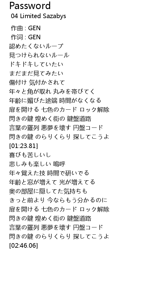 | [02:22.56] | 扉を開ける 七色のカード ロック解除 |