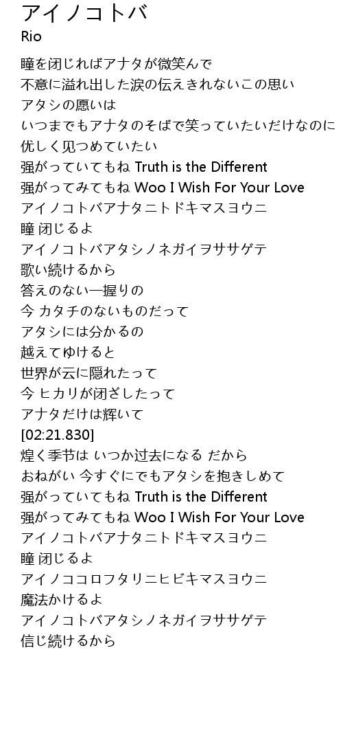 | [01:41.182] | アイノコトバアタシノネガイヲササゲテ |