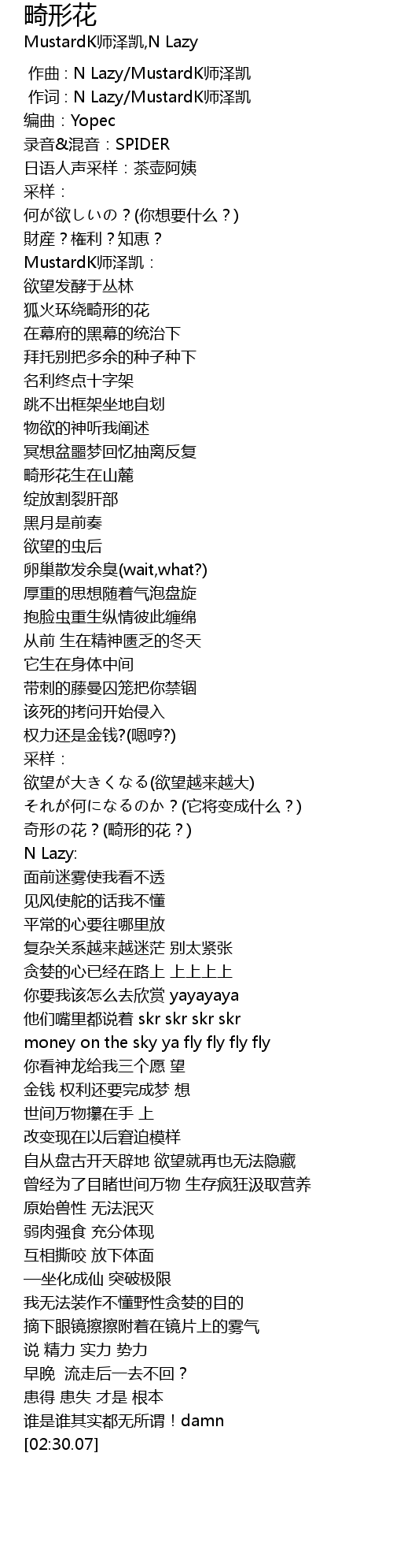 | [00:00.346] | 作词 : N Lazy/MustardK师泽凯 |