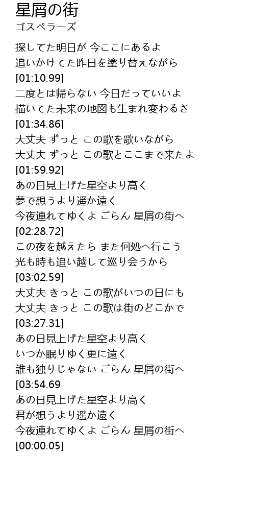 | [04:08.59] | 今夜連れてゆくよ ごらん 星屑の街へ |
