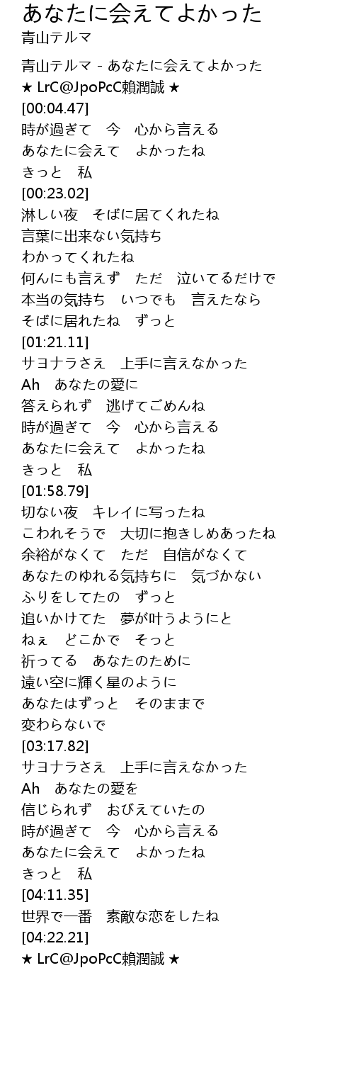 | [00:00.00] | 青山テルマ - あなたに会えてよかった |