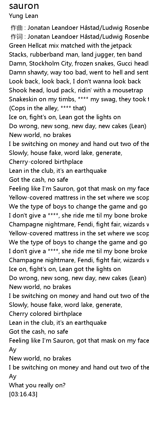 | [03:00.31] | Feeling like I'm Sauron, got that mask on my face |