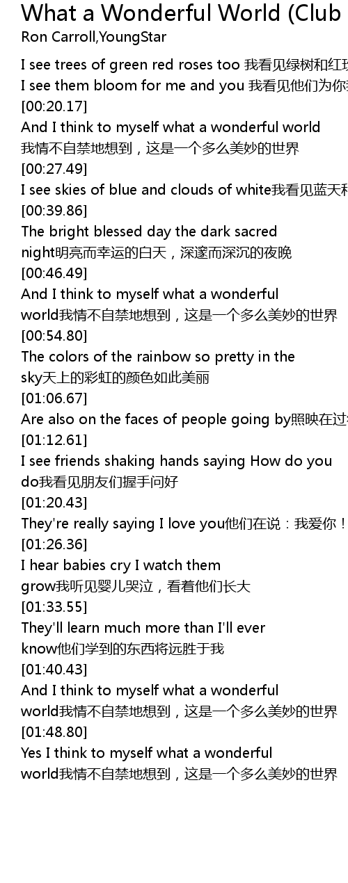 | [01:53.31] | Yes I think to myself what a wonderful world wo qing bu zi jin di xiang dao, zhe shi yi ge duo me mei miao de shi jie |