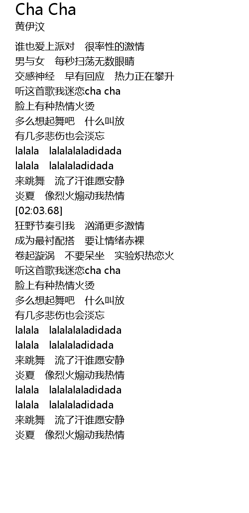 | [01:34.27] | 听这首歌我迷恋cha cha |