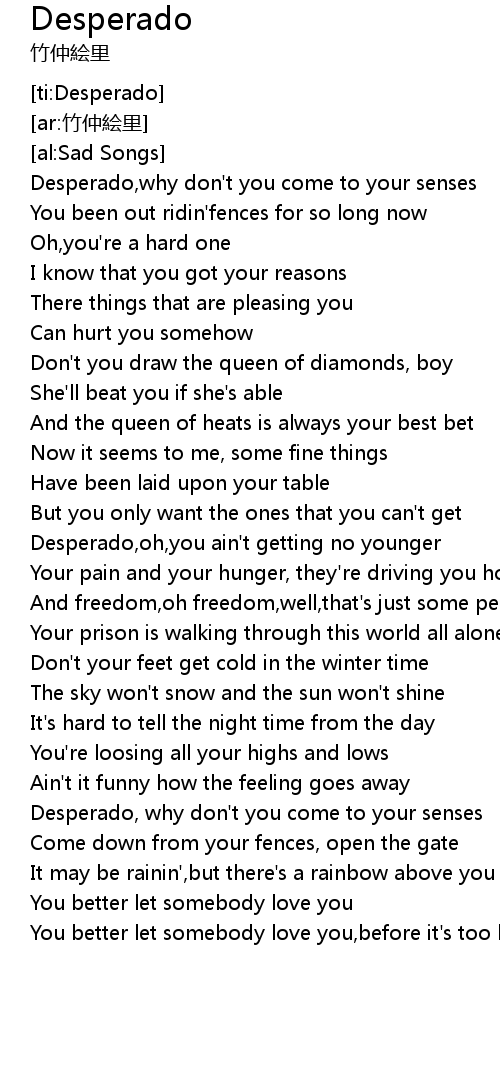 | [02:26.58] | Desperado, why don't you come to your senses |