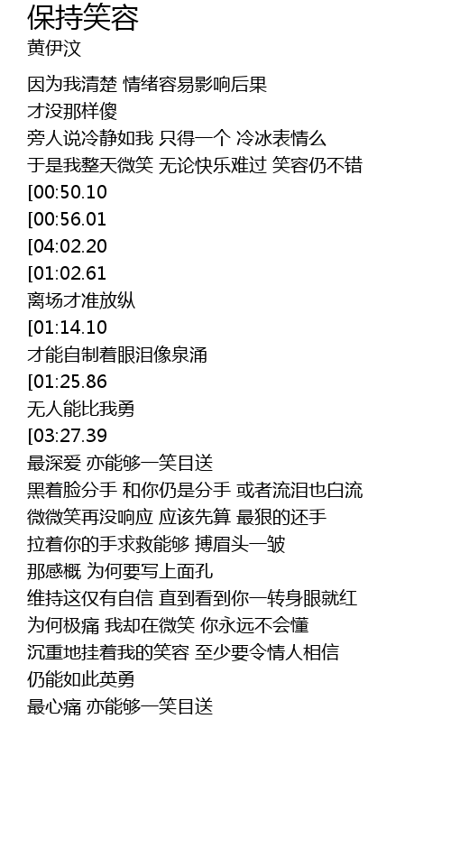 | [03:03.70][01:14.10] | 微笑着笑得嘴巴 也觉酸痛 才能自制着眼泪像泉涌 |