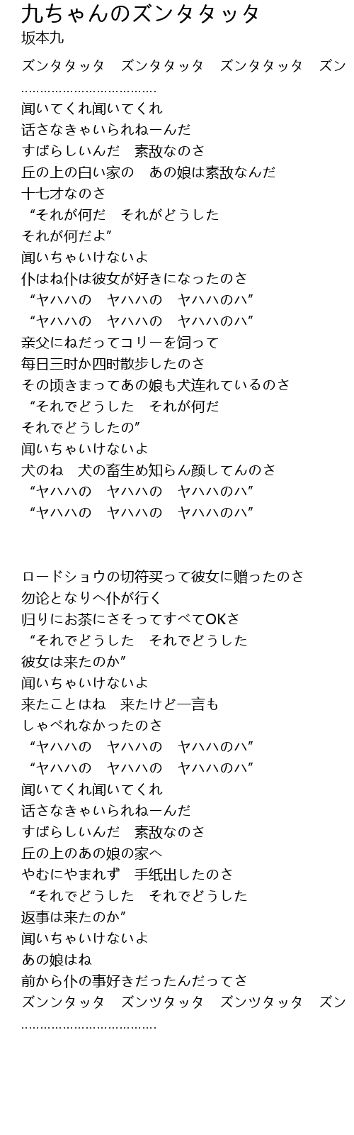 | Song | 九ちゃんのズンタタッタ |