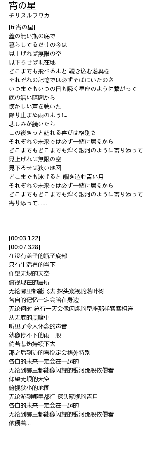 | [01:07.337] | いつまでもいつの日も瞬く星座のように繋がって |