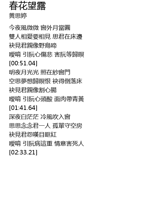 | [00:34.62] | 袂見君親像野鳥啼 |