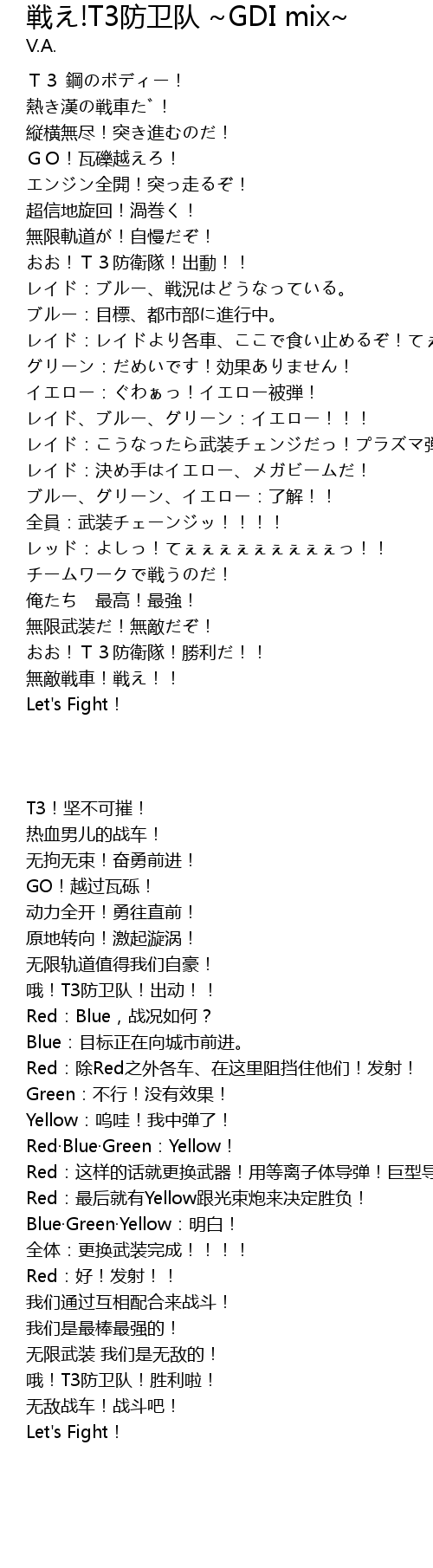 | Song | 戦え!T3防卫队 ~GDI mix~ |