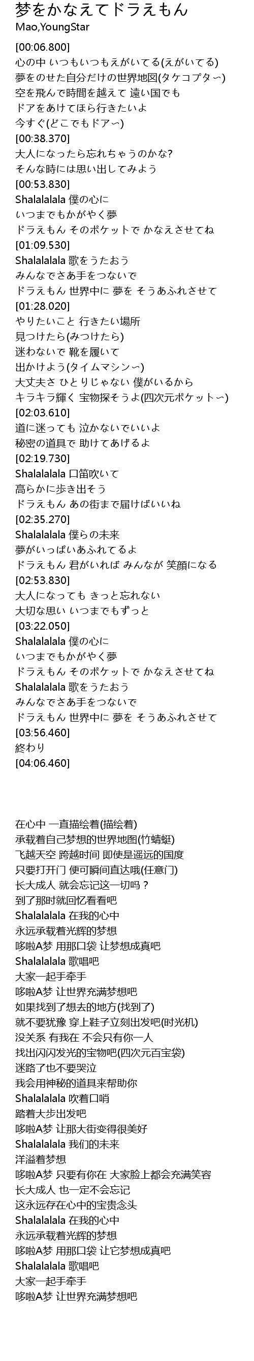 | [03:46.250] | ドラえもん 世界中に 夢を そうあふれさせて |