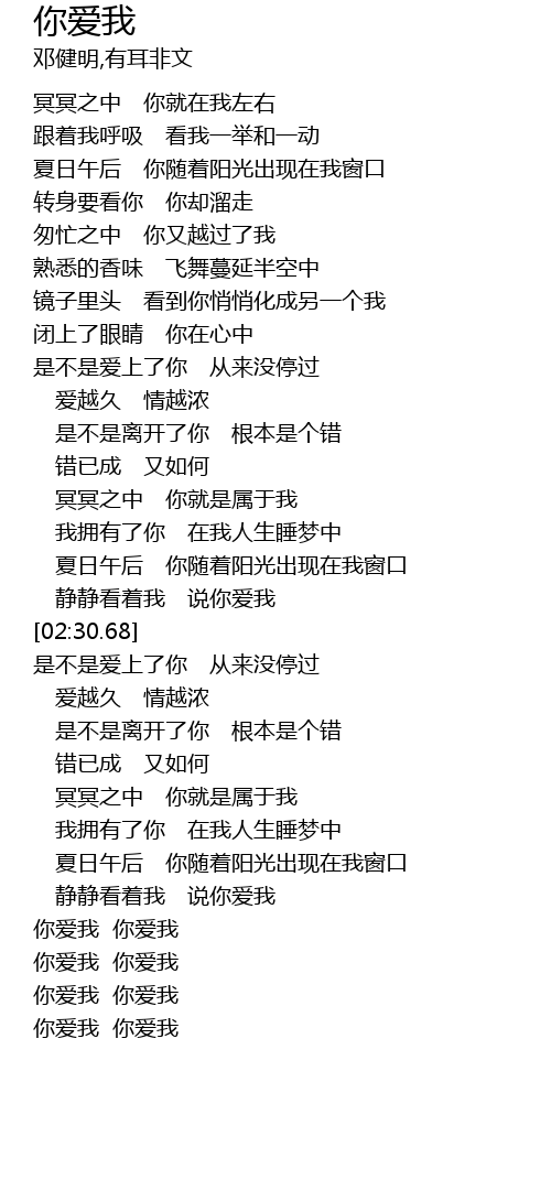 | [03:55.44] | nǐ ài wǒ nǐ ài wǒ |