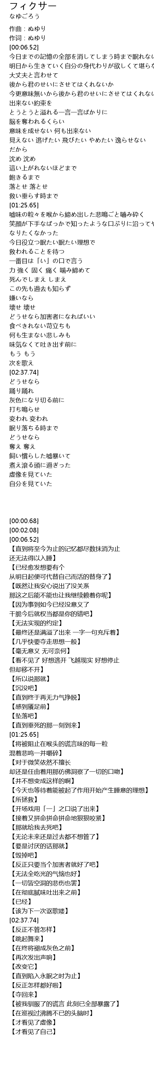 | [01:39.83] | 嘘味の粒々を喉から締め出した悲鳴ごと嚙み砕く |