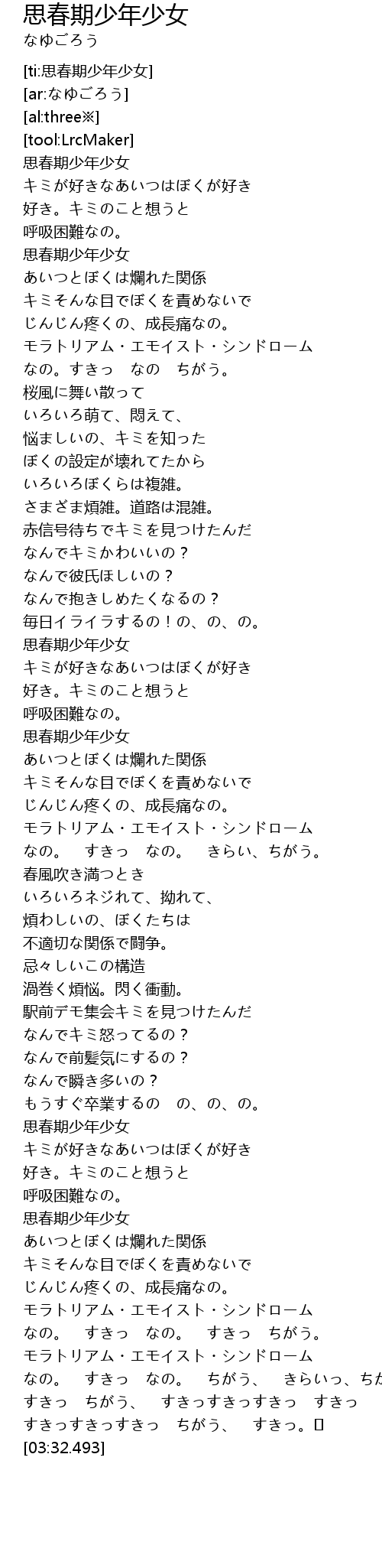 | [00:03.134] | sī chūn qī shào nián shào nǚ |
