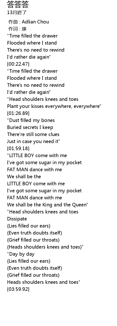 | [03:54.71] | Heads shoulders knees and toes" |