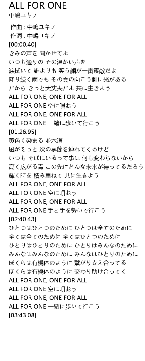 | [03:26.24] | ALL FOR ONE, ONE FOR ALL |
