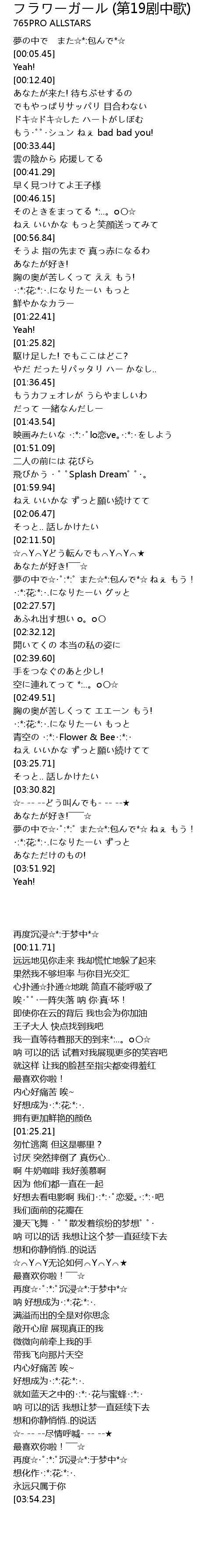 | [01:56.53] | 飛びかう ・ ゚ ゚Splash Dream゚ ゚・。 |