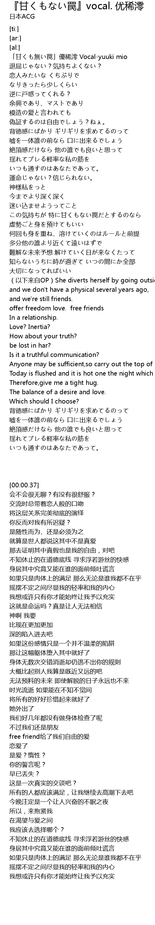 | [00:00.37] | 「甘くも無い罠」優稀澪 Vocal-yuuki mio |