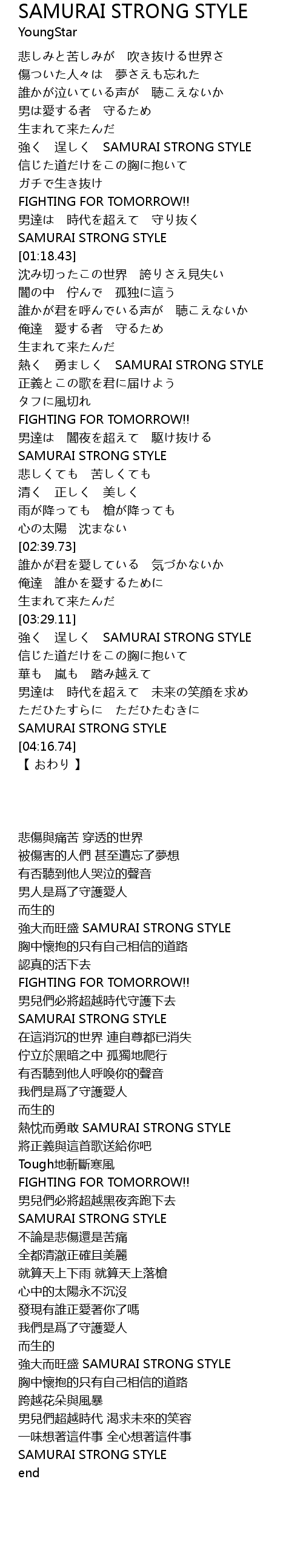 | [01:53.02] | 熱く 勇ましく SAMURAI STRONG STYLE |