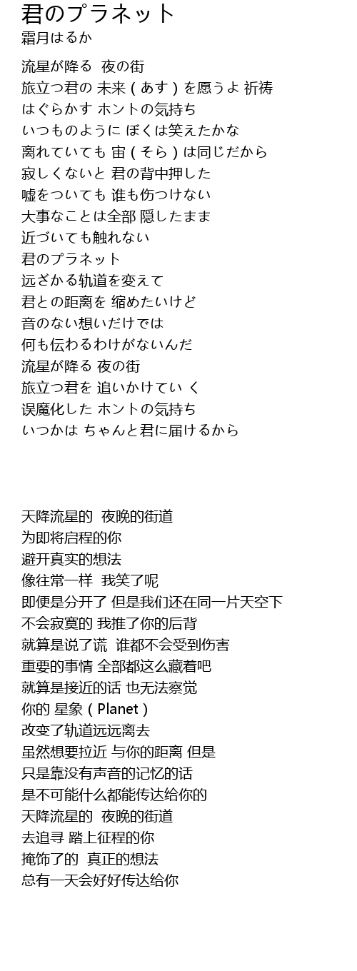 | [00:46.000] | 离れていても 宙(そら)は同じだから |