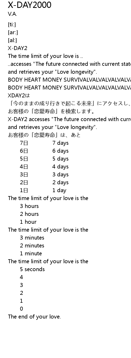 | [00:23.07] | BODY HEART MONEY SURVIVALVALVALVALVALVALVAL‥‥ |