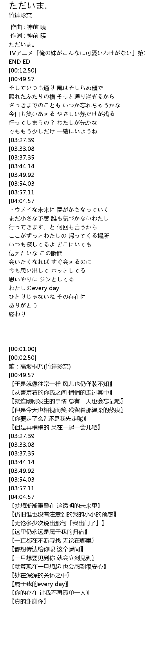 | [00:02.50] | TVアニメ「俺の妹がこんなに可愛いわけがない」第12話GOOD END ED |