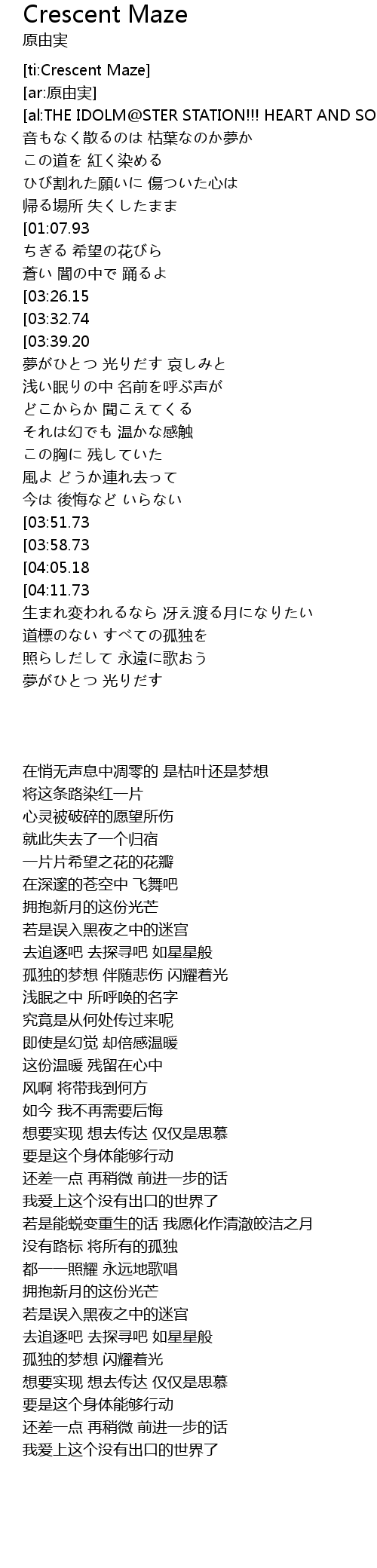 | [01:08.34][03:26.15] | 三日月の輝きを抱きしめて |