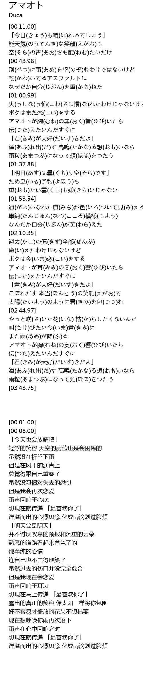 | [01:15.18] | アマオトが胸(むね)の奥(おく)響(ひび)いたら |