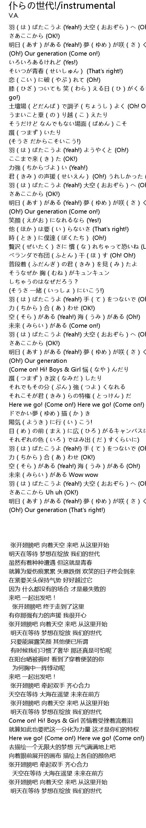 | [03:29.04] | 明日(あす)がある (Yeah!) 夢(ゆめ)が咲(さ)く (Oh!) Our generation (That's right!) |
