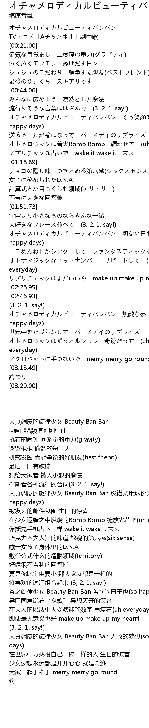 | [02:03.69] | オチャメロディカルビューティバンバン 切ない日も (so happy days) |