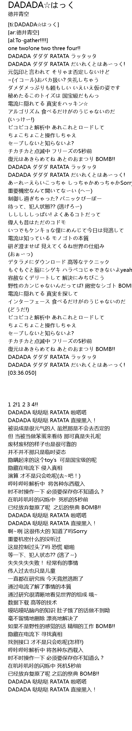 | [00:10.150] | DADADA ダダダ RATATA だいれくとはあ〜っく! |