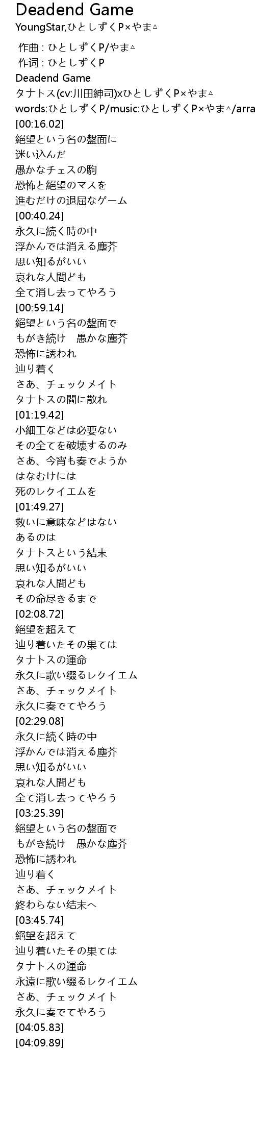 | [00:07.90] | タナトス(cv:川田紳司)xひとしずくP×やま△ |