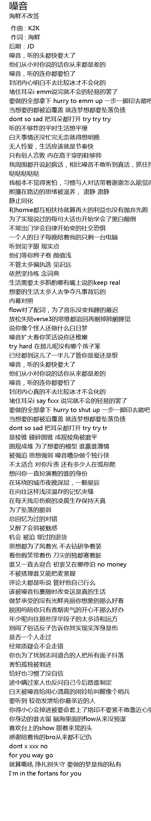 | [00:51.861] | 我周围都开说起疯话,相比噪音不敢听到真话,抓住挣扎现状的尾巴带来的浮夸不停增大 哒哒哒哒哒 |