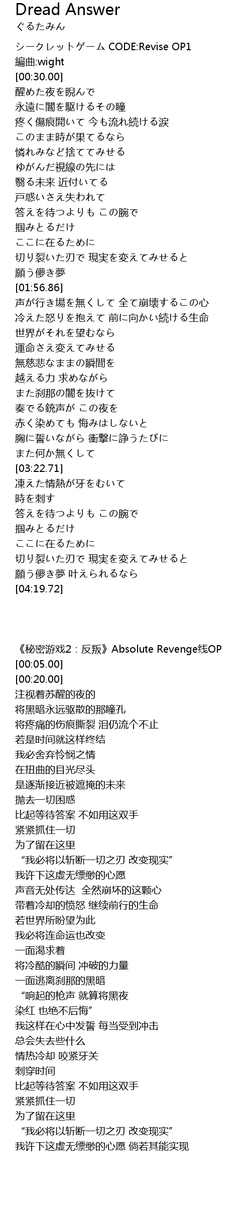 | [00:05.00] | シークレットゲーム CODE:Revise OP1 |