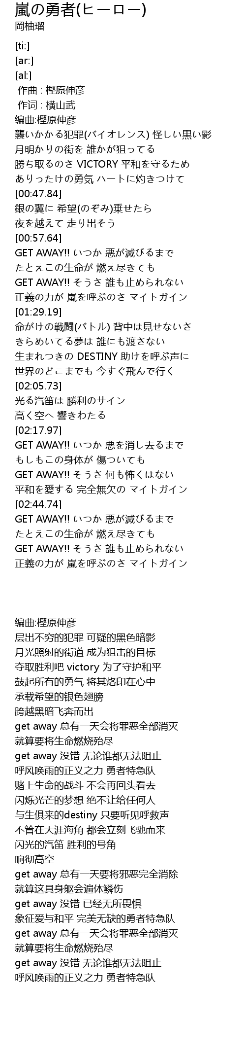 | [02:18.83] | GET AWAY!! いつか 悪を消し去るまで |